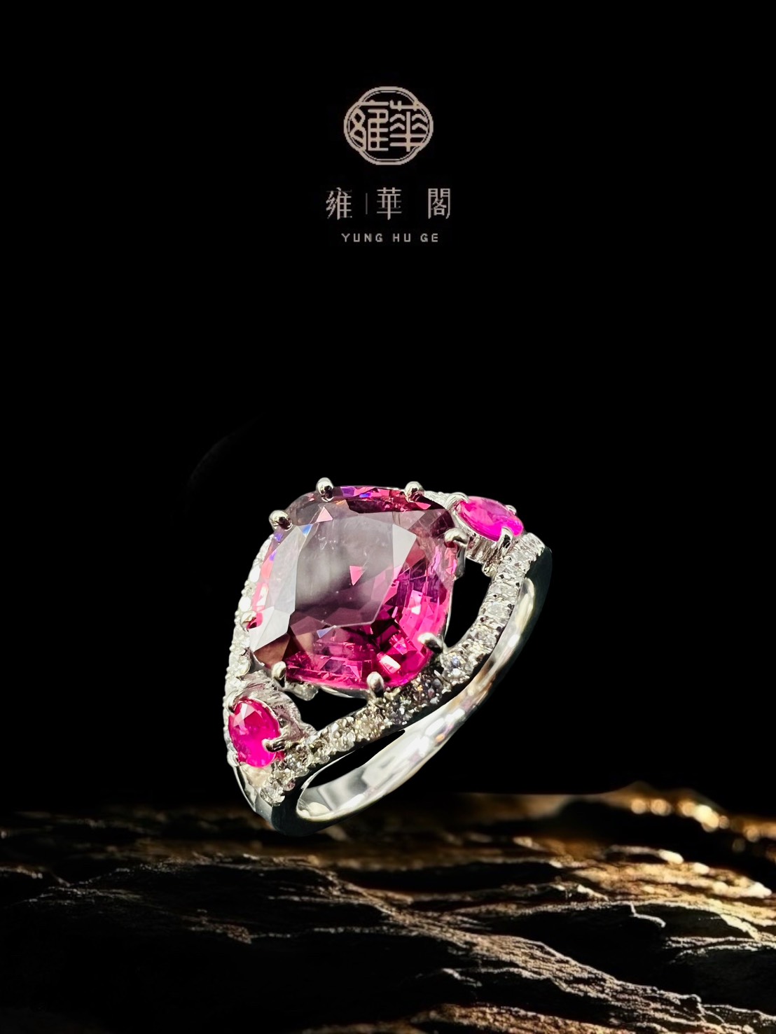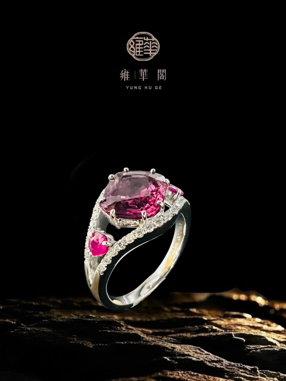商品規格 • 中央主石:紫紅色尖晶石 2.33 ct • 配石:天然真鑽 0.24 ct、紅寶石 2 顆 • 材質:鉑金 • 戒圍:12 圍