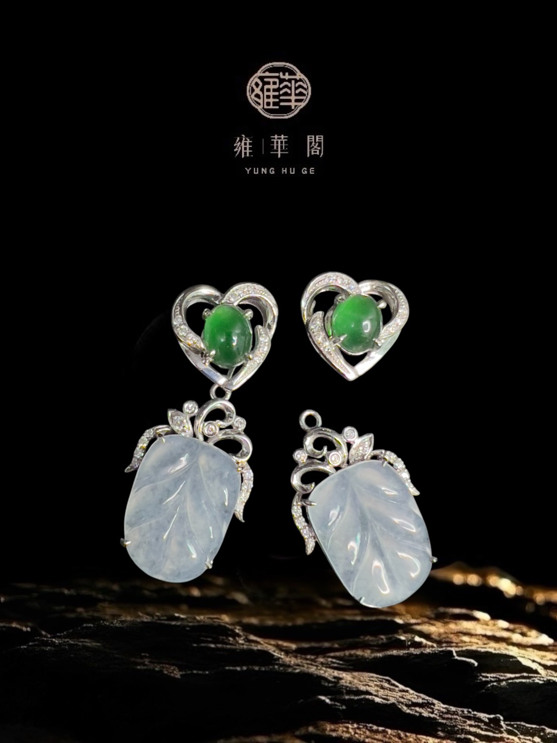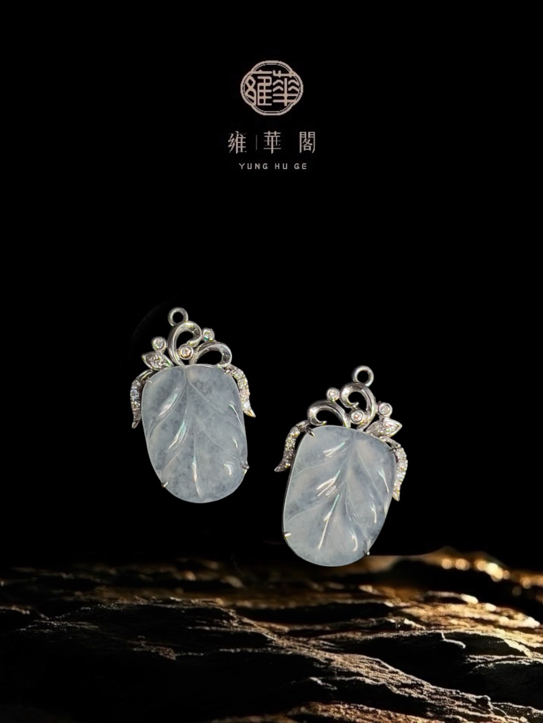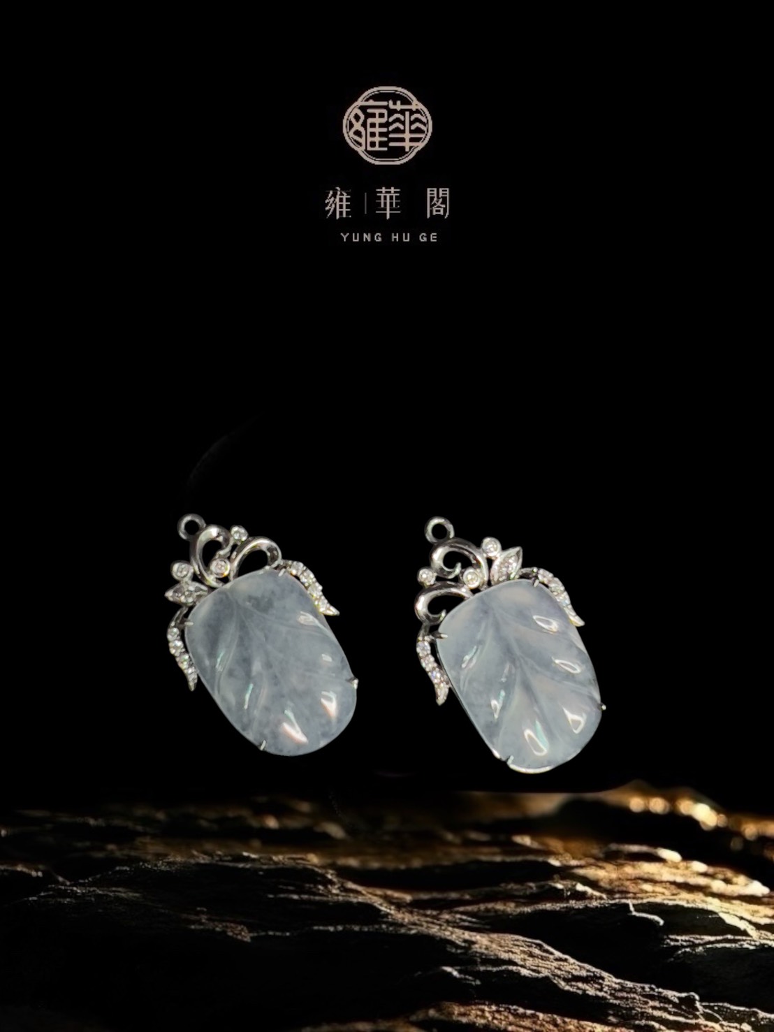 白翡通透如玉,葉形線條清雅舒展,光澤溫潤而內斂;鑽石細緻鑲嵌於鉑金之上,為純淨留下一抹精緻亮點。